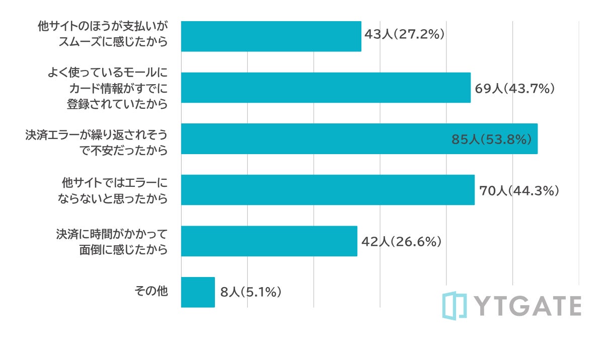 - 流出理由は「エラー再発への不安(53.8%)」「カード情報の登録済み環境(43.7%)」「他サイトでの正常動作期待(44.3%)」などが多数
