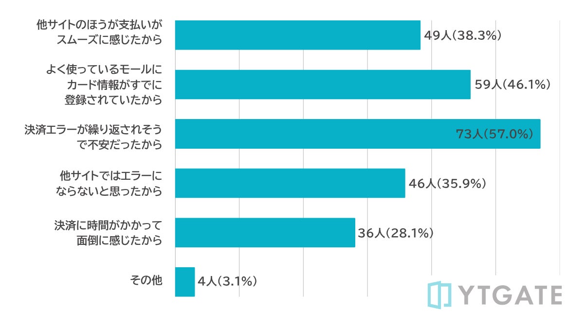- 流出理由は「エラー再発への不安(57.0%)」「カード情報の登録済み環境(46.1%)」「支払いがスムーズだったから(38.3%)」などが多数