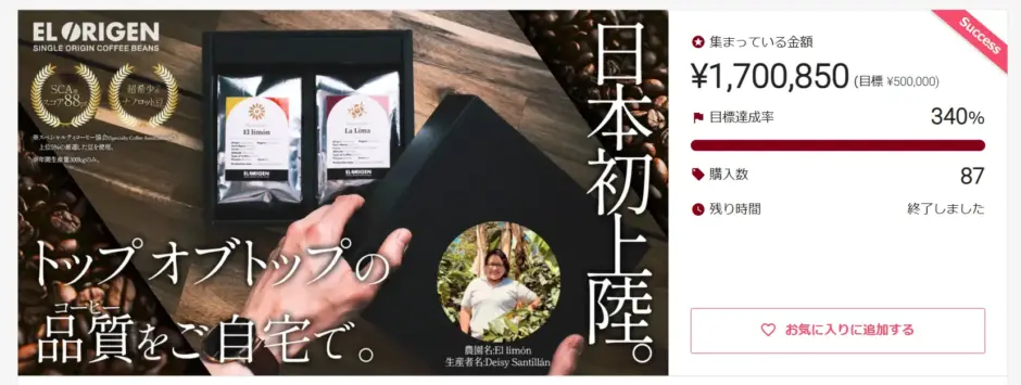 EL ORIGENスペシャルティコーヒーのクラウドファンディングが2025年8月31日に終了し、当初目標の50万円を大幅に上回る170万円の調達を達成いたしました。**達成率340%**という結果により、IBUSHIGIN史上第3位の支援額を記録する快挙となりました。