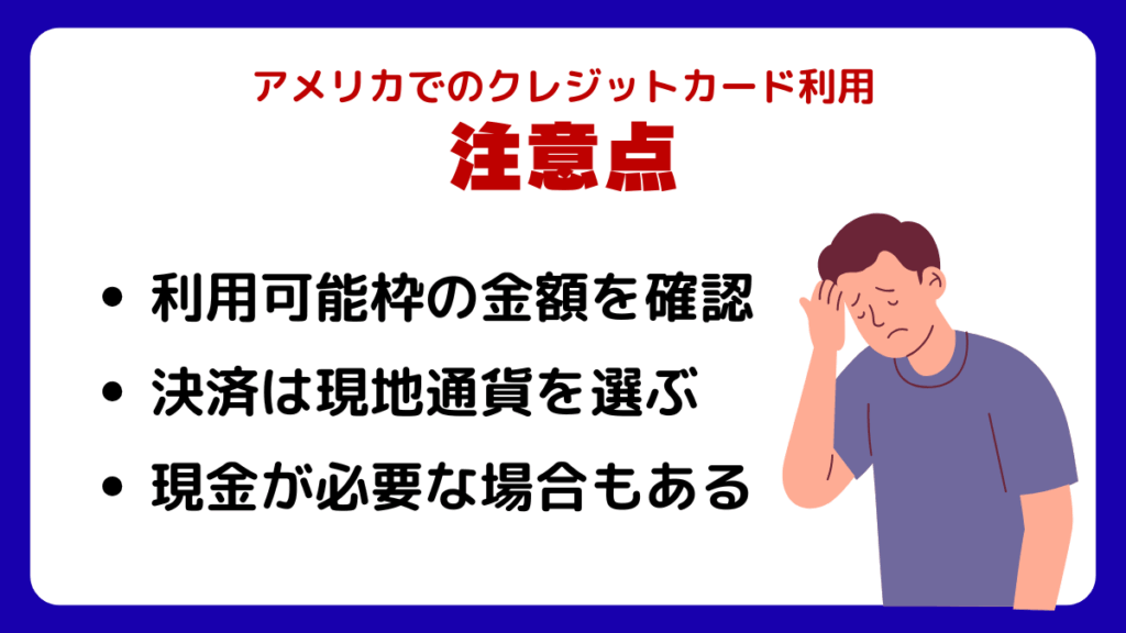 アメリカでクレジットカードを利用する時には利用可能枠の金額を確認すること、そして決済は現地通貨にすることを心がけるようにしましょう。