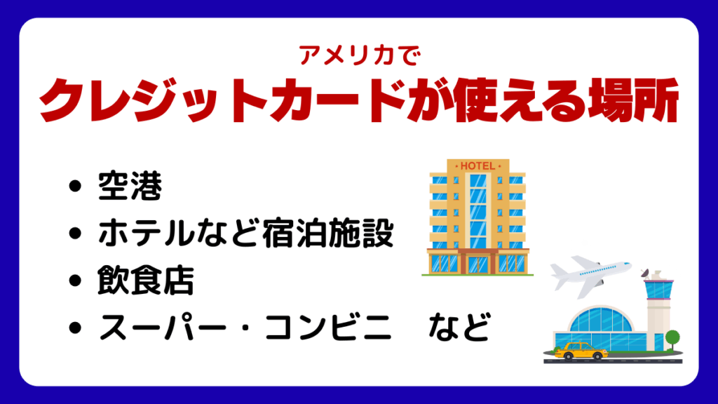 アメリカでクレジットカードが使える場所は主に以下の通りです。