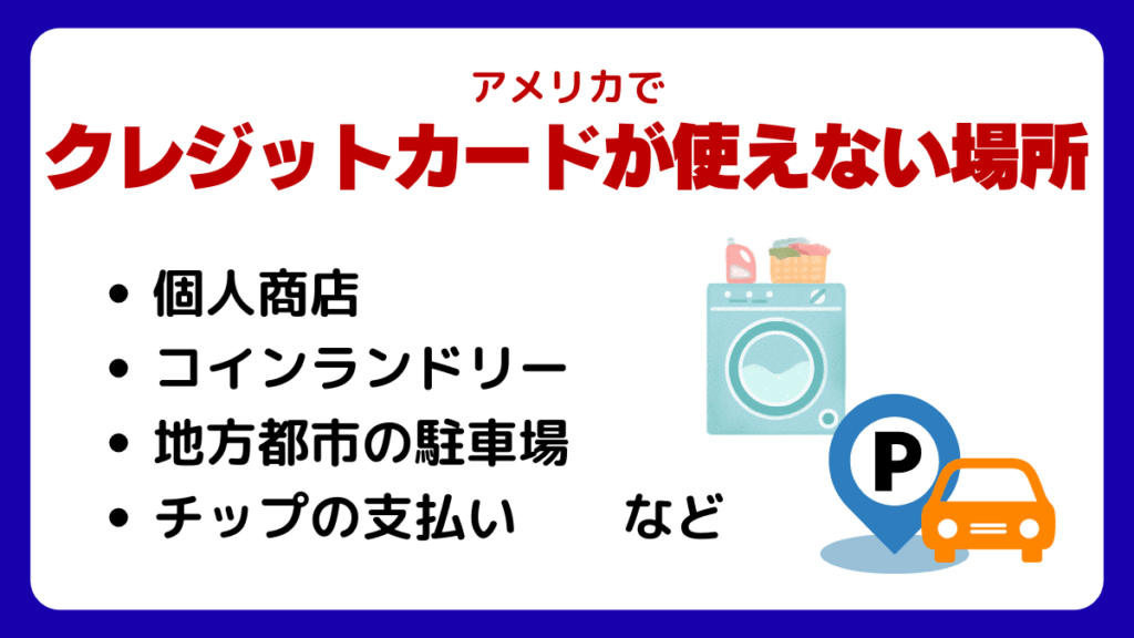 アメリカにおいても、クレジットカードが使えない場所が一部存在します。使える場所と同じく、使えない場所も一覧で表示しました。