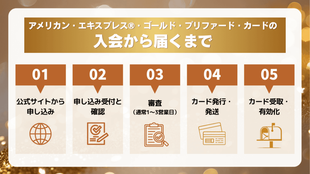 アメリカン・エキスプレス®・ゴールド・プリファード・カードは、その豪華な特典と高いステータス性から、多くの方が憧れる存在となっています。申し込みからカードが手元に届くまでのプロセスも非常にスムーズで、手間をかけずに所有できるのが魅力です。ここでは、実際に申し込んでからカードが届くまでの5つのステップをわかりやすく解説します。
