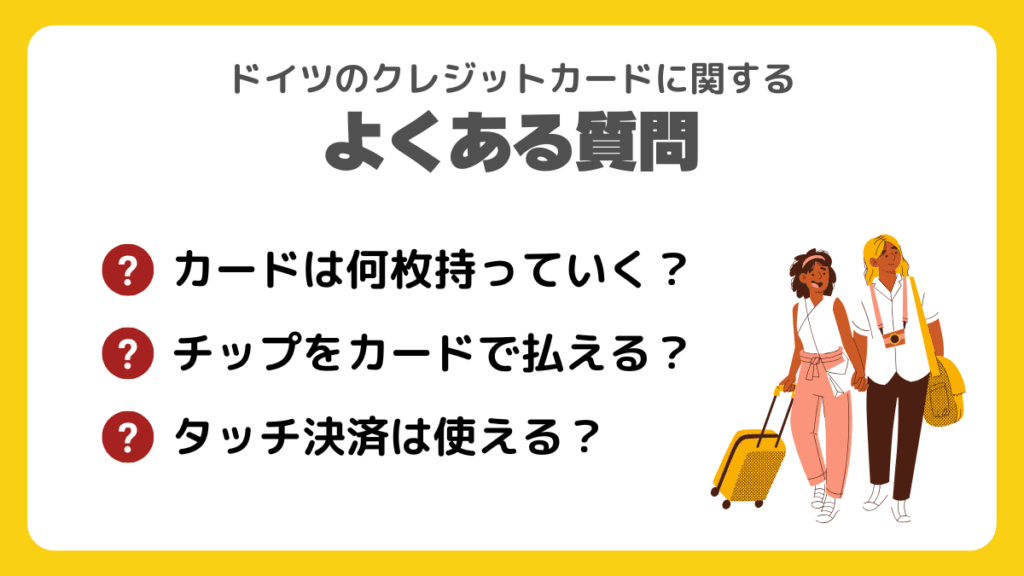 「カードって何枚あればいいの?」「チップも支払える?」このようなよくある質問をまとめています。クレジットカードはお金に関係する問題なので、ドイツ旅行前にしっかりチェックしておきましょう。