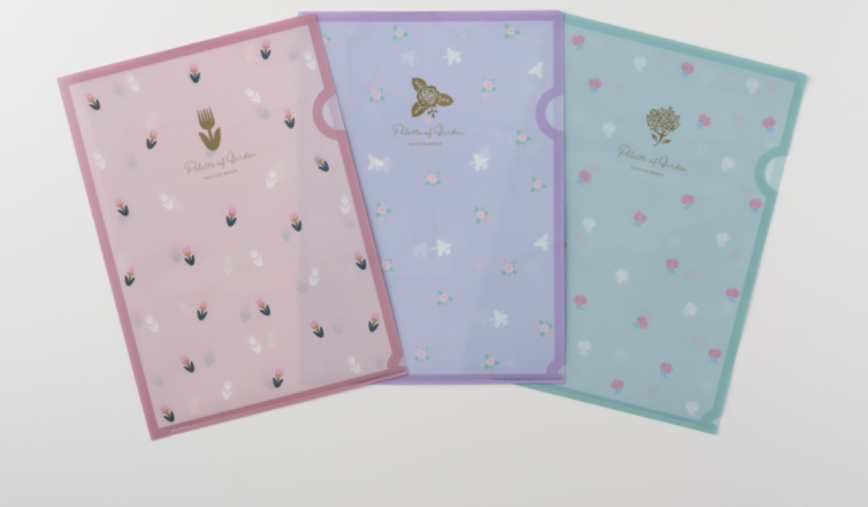 ハウステンボスの人気シリーズ「Palette of garden」は、色とりどりの花々が咲き誇る庭園をモチーフにした雑貨ライン。A4サイズのクリアファイルは、ローズ(パープル)、チューリップ(ピンク)、あじさい(ミント)の3種類が揃い、それぞれが季節の花のやさしい色合いをそのまま写し取ったようなデザインです。