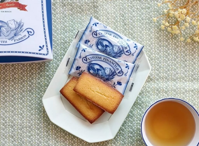 しっとりとした生地にたっぷりと練り込まれたゴーダチーズ約60%配合の「チーズフィナンシェ」。焼き上げることで生まれる香ばしい焼き目と、ふんわり軽やかな食感が特徴です。ハウステンボス内の工房で、「タンテ・アニー」の名を冠する温もりある味を届ける一品。