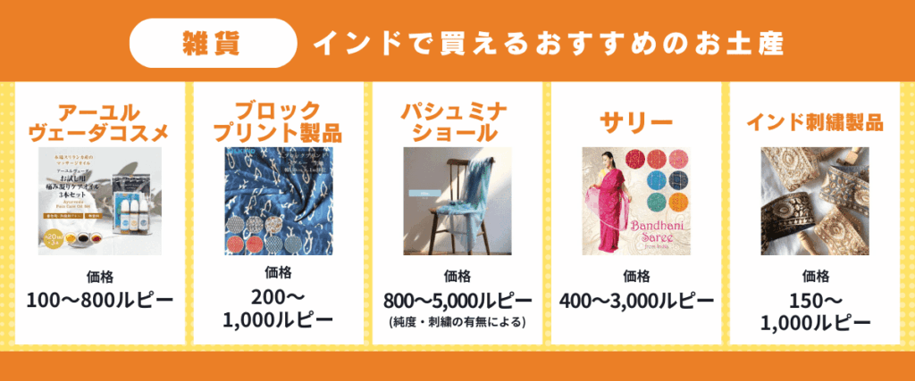 | 価格 | 150〜1,500ルピー(アイテムや布の種類により異なる) |