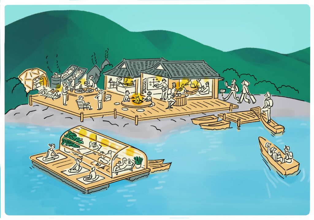 静かな湾内を船で進み、陸から離れた場所に降り立つ。その体験そのものが、日常から心身を切り替えるための“入口”です。ここでは、観光地的な賑わいとは異なるかたちで、人がリラックスする場として親しまれています。