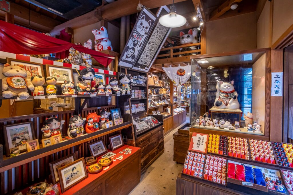 『吉兆招福亭』は、大量の招き猫が販売されている専門店。店前の巨大な招き猫はもちろんのこと、約1,000種類以上の招き猫がそろっています。店内は招き猫で囲まれた空間となっているので、入っただけで縁起のよさを体感できるかもしれません。
