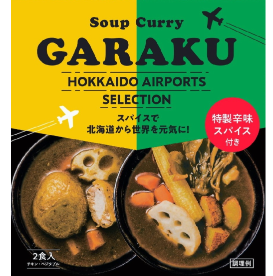 女満別空港を含め、北海道7空港で販売されており、秘伝辛味スパイスが入ったチキンスープカレーと5種類の野菜が入ったベジタブルカレーの2食が味わえます。