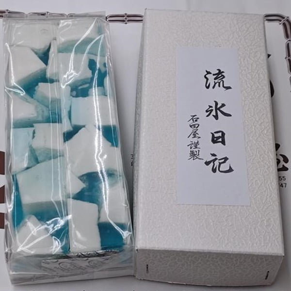 「流氷日記」の正体は、ようかん!透明な部分は青色の寒天、流氷の部分は卵白、土台の部分はあんことなっており、さまざまな味が楽しめます。かなり甘口となっているので、抹茶やコーヒーと一緒に味わってみるのがおすすめです。