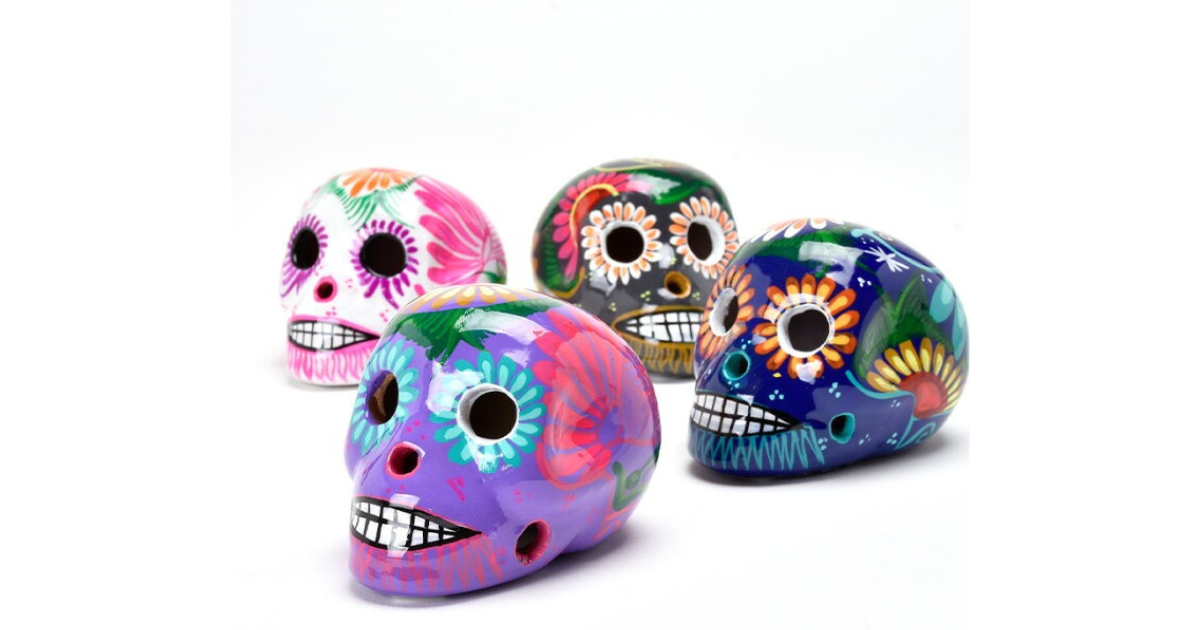 色彩豊かに描かれた骸骨は一見ユーモラスで、死を恐れるのではなく明るく受け入れるメキシコ独自の文化を象徴しています。紙細工のガイコツ人形や陶器製の装飾品、アクセサリーなど種類も豊富で、観光客から大変人気があります。