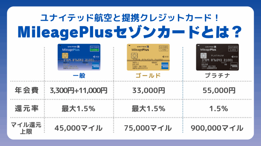 カードはMileagePlusセゾンカード(一般)」MileagePlusセゾンカードゴールド」「MileagePlusセゾンカードプラチナ」の3種類で、グレードによって年会費や還元率、付帯特典が異なります。旅行保険やユナイテッドクラブパスなどの特典も充実していて、利用スタイルに合わせて選択可能です。
