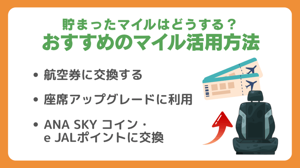 ただし、電子マネーや商品交換などに使うと1マイル=1円以下になることも。なるべく航空券やアップグレードなど「現金で買うと高額なもの」に使うと、マイルの価値を最大化できます。