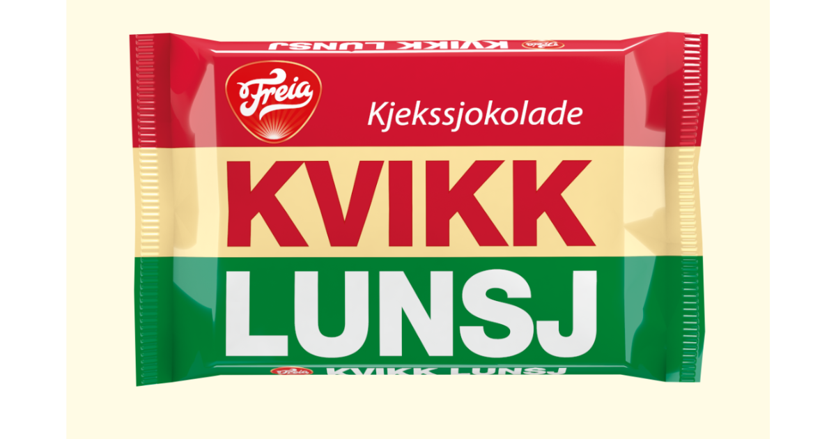 「Kvikk Lunsj(クヴィック・ルンシュ)」は、1937年に発売された赤と黄色、緑色の3色の包装紙が魅力的なチョコバー!四つの薄いウエハースをミルクチョコレートで包んだ一品で、ノルウェー版キットカットとも呼ばれています。