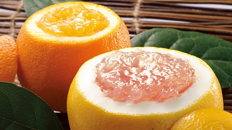 くりぬいた果物の果肉をピューレにし、上質なゼラチンで固めて再び元の果物の皮に戻して作られているため、見た目のインパクトも抜群。そしてみずみずしいフレッシュな味わいが魅力です。特別な日のデザートとしても喜ばれる事間違いなしの一品です。