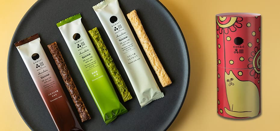パイ生地専門ブランド「coneri」が贈る、見た目も味も楽しめるスティックパイの詰め合わせ。品川ゆかりのアーティスト・フカザワユリコとのコラボによる、金色のネコが描かれた可愛らしいパッケージが目を引きます。生地は素材や製法に徹底的にこだわり、サクサクと軽やかで香ばしい仕上がりです。