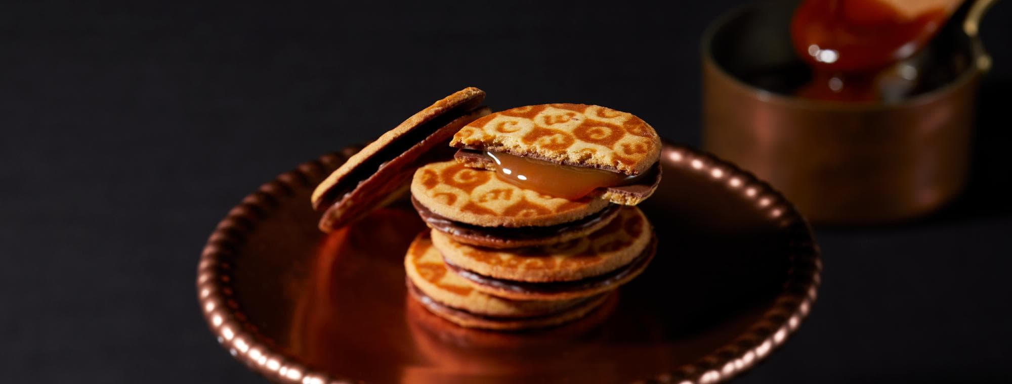 「キャラメルウィッチ」は、東京・銀座発の洋菓子ブランド「テラ・コンフェクト」が手掛ける、上品な甘さのキャラメルスイーツ。サクサク食感のキャラメルクッキーで、とろりととろけるキャラメルソースをサンドし、さらに全体をチョコレートでコーティングしています。