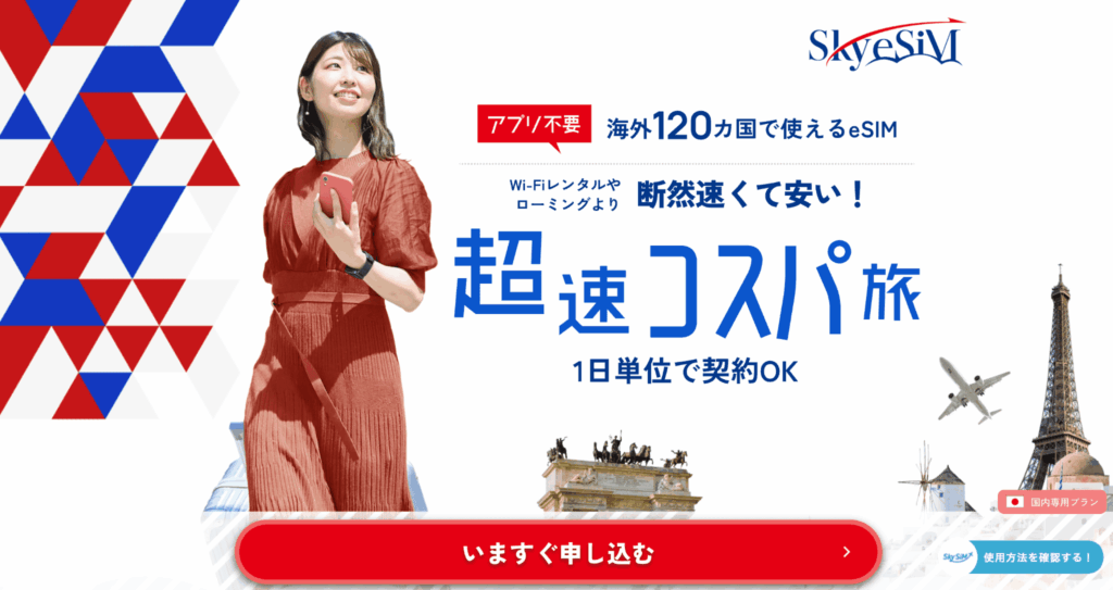 Sky eSIMはイギリス発のeSIMサービスで、iphoneとAndroid端末両方に対応しており、オンラインで簡単にプラン購入とQRコード取得が可能な点が大きな特徴です。渡航前にインストールできるため、現地到着直後から通信をはじめられます。特に都市間移動や短期滞在でLTE/5G通信を活用したいと考えている旅行者におすすめできるeSIMです。