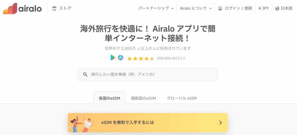 | 提供会社 | Airalo(米国企業)運営のeSIMマーケットプレイス。200+国で対応ユーザーも多い |