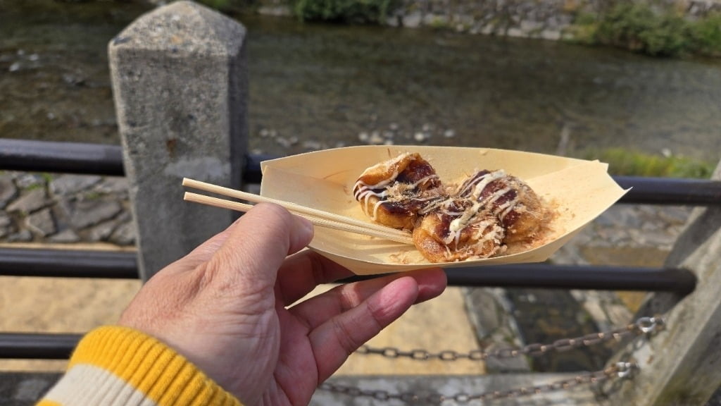 たこ焼き さごうは、飛騨高山の宮川朝市で営業しており、観光スタート前の腹ごしらえにぴったりな食べ歩きアイテムです。使われる素材にもこだわりがあり、石川県輪島産のタコと飛騨高山産のネギを組み合わせることで、タコの旨味とネギの甘みが程よく薫る一品です。