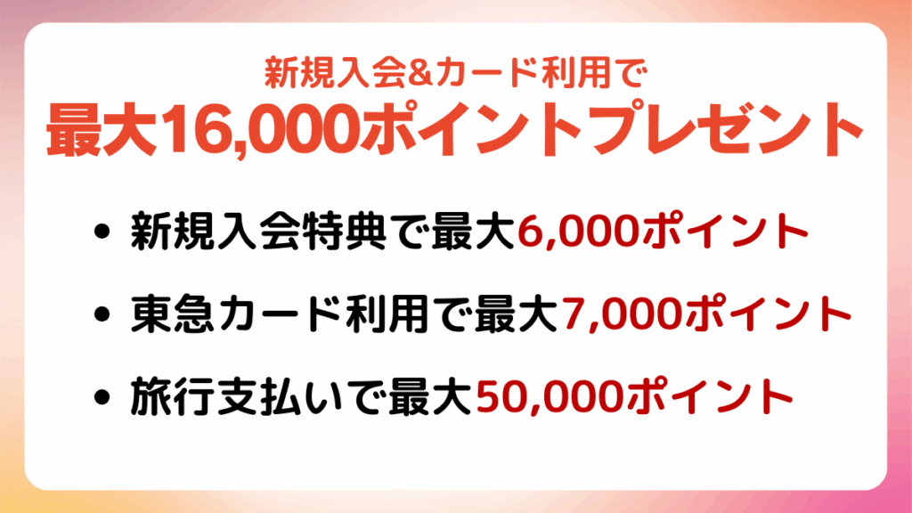 東急カードでは入会&カード利用で最大16,000TOKYU POINTがもらえるキャンペーンを実施しています。入会特典やカード利用、通勤定期購入によるポイント付与の詳細を知り、お得に活用しましょう。