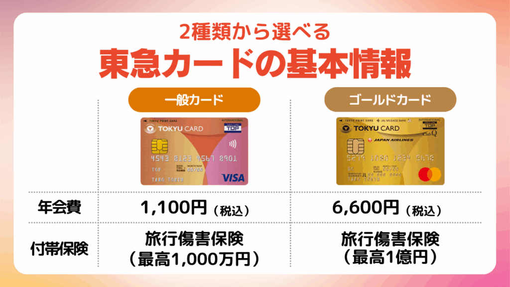 東急カードには、一般カードとゴールドカードの2種類があり、それぞれに特徴があります。一般カードは年会費が手頃で日常的な利用に適しています。一方ゴールドカードは旅行傷害保険の補償額が高く、旅行や出張が多い方におすすめです。